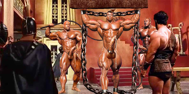 His attackers have dumped the huge hunk into the sewers below the city. They have fastened a thick metal shackle securely around the base of his massive nuts, and then attached that shackle by an unbreakable chain to a bolt in the cement floor. His powerful arms are bound behind his back to a thick steel pipe, but the ropes used to bind his wrists are old and weathered. The lad's attackers actually INTEND for the stud to break free of the bindings at his wrists, but with his precious man nuts chained to the floor, the only way for the young muscle bull to win his freedom would be to rip his own big balls off!